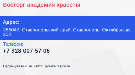 Восторг, академия красоты по адресу 355047, Ставропольский край, Ставрополь, Октябрьская, 202 в дальнейшем Организация, размещена в следующих категориях: