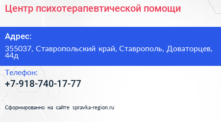 Центр психотерапевтической помощи по адресу 355037, Ставропольский край, Ставрополь, Доваторцев, 44д в дальнейшем Организация, размещена в следующих категориях: