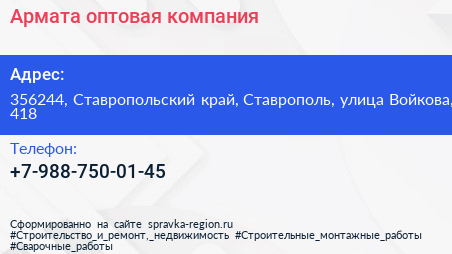 Армата, оптовая компания по адресу 356244, Ставропольский край, Ставрополь, улица Войкова, 418 в дальнейшем Организация, размещена в следующих категориях: