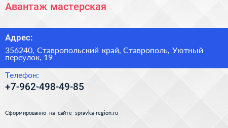 Авантаж, мастерская по адресу 356240, Ставропольский край, Ставрополь, Уютный переулок, 19 в дальнейшем Организация, размещена в следующих категориях: