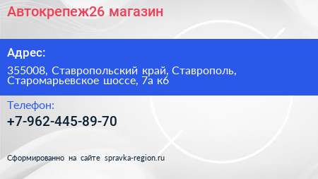 Автокрепеж26, магазин по адресу 355008, Ставропольский край, Ставрополь, Старомарьевское шоссе, 7а к6 в дальнейшем Организация, размещена в следующих категориях: