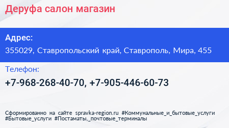 Деруфа, салон-магазин по адресу 355029, Ставропольский край, Ставрополь, Мира, 455 в дальнейшем Организация, размещена в следующих категориях: