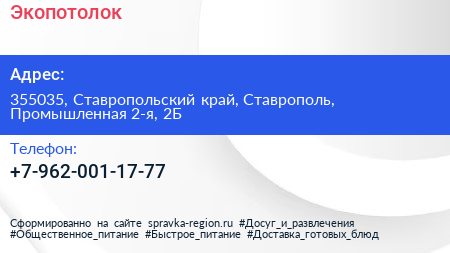 Экопотолок по адресу 355035, Ставропольский край, Ставрополь, Промышленная 2-я, 2Б в дальнейшем Организация, размещена в следующих категориях: