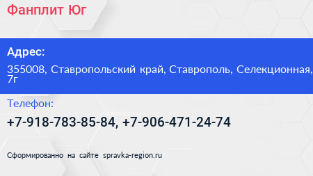 Фанплит-Юг по адресу 355008, Ставропольский край, Ставрополь, Селекционная, 7г в дальнейшем Организация, размещена в следующих категориях: