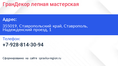 ГранДекор, лепная мастерская по адресу 355019, Ставропольский край, Ставрополь, Надежденский проезд, 1 в дальнейшем Организация, размещена в следующих категориях: