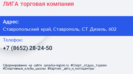 ЛИГА, торговая компания по адресу Ставропольский край, Ставрополь, СТ Дизель, 602 в дальнейшем Организация, размещена в следующих категориях: