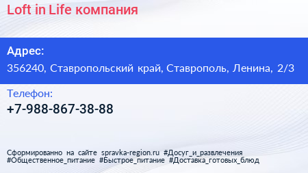 Loft in Life, компания по адресу 356240, Ставропольский край, Ставрополь, Ленина, 2/3 в дальнейшем Организация, размещена в следующих категориях: