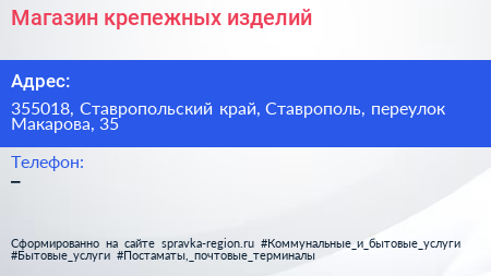 Магазин крепежных изделий по адресу 355018, Ставропольский край, Ставрополь, переулок Макарова, 35 в дальнейшем Организация, размещена в следующих категориях: