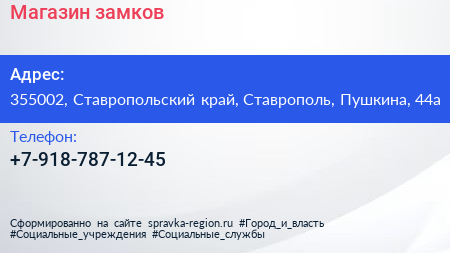 Магазин замков по адресу 355002, Ставропольский край, Ставрополь, Пушкина, 44а в дальнейшем Организация, размещена в следующих категориях: