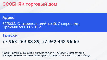 ОСОБНЯК, торговый дом по адресу 355035, Ставропольский край, Ставрополь, Промышленная 2-я, 2 в дальнейшем Организация, размещена в следующих категориях: