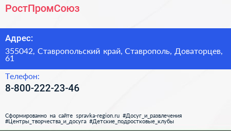РостПромСоюз по адресу 355042, Ставропольский край, Ставрополь, Доваторцев, 61 в дальнейшем Организация, размещена в следующих категориях: