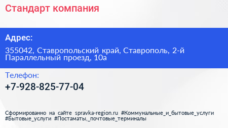 Стандарт, компания по адресу 355042, Ставропольский край, Ставрополь, 2-й Параллельный проезд, 10а в дальнейшем Организация, размещена в следующих категориях: