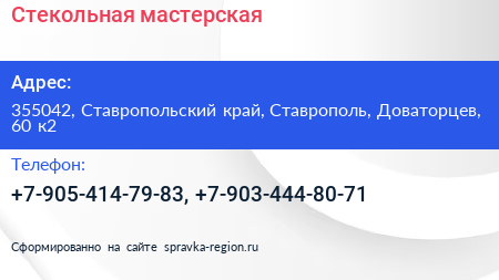 Стекольная мастерская по адресу 355042, Ставропольский край, Ставрополь, Доваторцев, 60 к2 в дальнейшем Организация, размещена в следующих категориях: