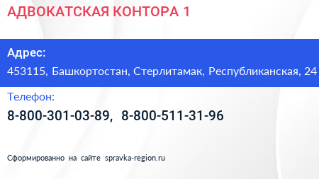 АДВОКАТСКАЯ КОНТОРА №1 по адресу 453115, Башкортостан, Стерлитамак, Республиканская, 24 в дальнейшем Организация, размещена в следующих категориях: