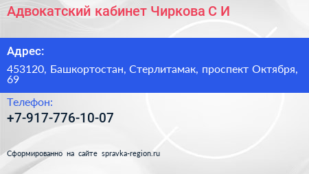 Адвокатский кабинет Чиркова С.И. по адресу 453120, Башкортостан, Стерлитамак, проспект Октября, 69 в дальнейшем Организация, размещена в следующих категориях: