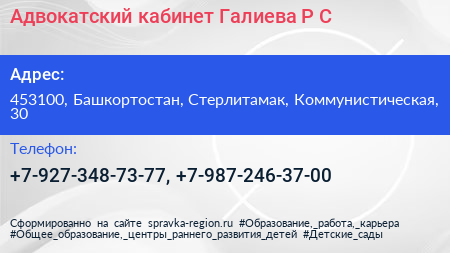 Адвокатский кабинет Галиева Р.С. по адресу 453100, Башкортостан, Стерлитамак, Коммунистическая, 30 в дальнейшем Организация, размещена в следующих категориях: