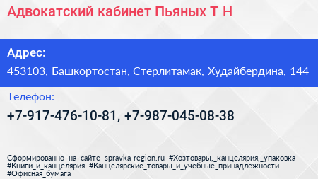 Адвокатский кабинет Пьяных Т.Н. по адресу 453103, Башкортостан, Стерлитамак, Худайбердина, 144 в дальнейшем Организация, размещена в следующих категориях: