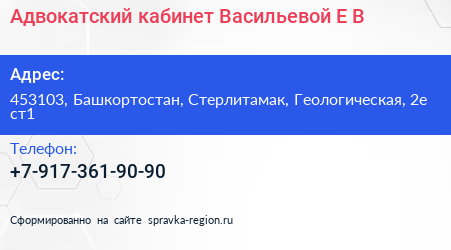 Адвокатский кабинет Васильевой Е.В. по адресу 453103, Башкортостан, Стерлитамак, Геологическая, 2е ст1 в дальнейшем Организация, размещена в следующих категориях: