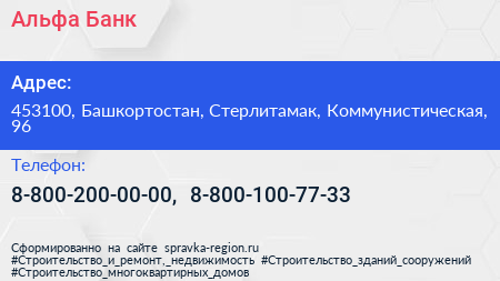 Альфа-Банк по адресу 453100, Башкортостан, Стерлитамак, Коммунистическая, 96 в дальнейшем Организация, размещена в следующих категориях: