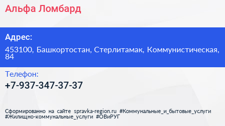 Альфа-Ломбард по адресу 453100, Башкортостан, Стерлитамак, Коммунистическая, 84 в дальнейшем Организация, размещена в следующих категориях: