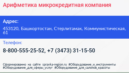 Арифметика, микрокредитная компания по адресу 453120, Башкортостан, Стерлитамак, Коммунистическая, 61 в дальнейшем Организация, размещена в следующих категориях: