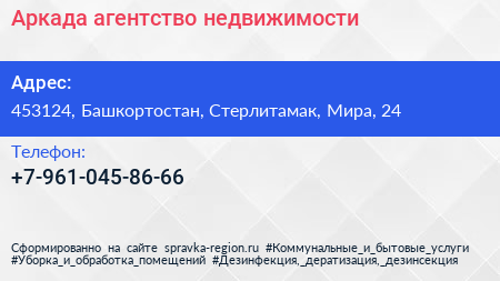 Аркада, агентство недвижимости по адресу 453124, Башкортостан, Стерлитамак, Мира, 24 в дальнейшем Организация, размещена в следующих категориях: