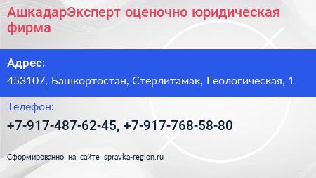 АшкадарЭксперт, оценочно-юридическая фирма по адресу 453107, Башкортостан, Стерлитамак, Геологическая, 1 в дальнейшем Организация, размещена в следующих категориях: