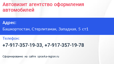 Автовизит, агентство оформления автомобилей по адресу Башкортостан, Стерлитамак, Западная, 5 ст1 в дальнейшем Организация, размещена в следующих категориях: