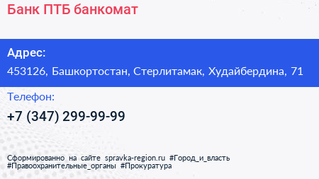 Банк ПТБ, банкомат по адресу 453126, Башкортостан, Стерлитамак, Худайбердина, 71 в дальнейшем Организация, размещена в следующих категориях: