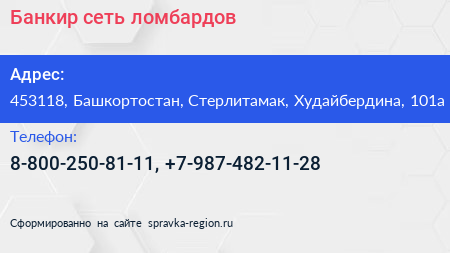 Банкир, сеть ломбардов по адресу 453118, Башкортостан, Стерлитамак, Худайбердина, 101а в дальнейшем Организация, размещена в следующих категориях:
