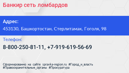 Банкир, сеть ломбардов по адресу 453130, Башкортостан, Стерлитамак, Гоголя, 98 в дальнейшем Организация, размещена в следующих категориях: