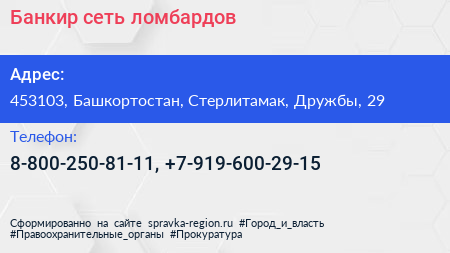 Банкир, сеть ломбардов по адресу 453103, Башкортостан, Стерлитамак, Дружбы, 29 в дальнейшем Организация, размещена в следующих категориях: