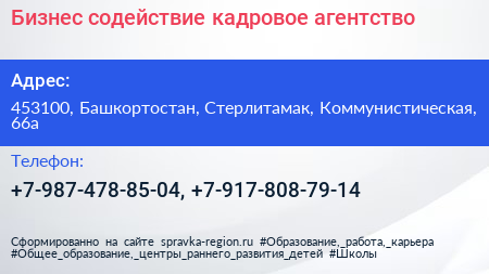 Бизнес-содействие, кадровое агентство по адресу 453100, Башкортостан, Стерлитамак, Коммунистическая, 66а в дальнейшем Организация, размещена в следующих категориях: