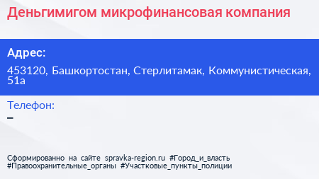 Деньгимигом, микрофинансовая компания по адресу 453120, Башкортостан, Стерлитамак, Коммунистическая, 51а в дальнейшем Организация, размещена в следующих категориях: