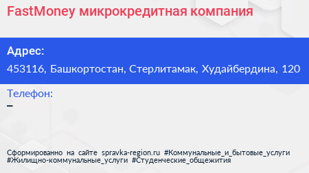 FastMoney, микрокредитная компания по адресу 453116, Башкортостан, Стерлитамак, Худайбердина, 120 в дальнейшем Организация, размещена в следующих категориях: