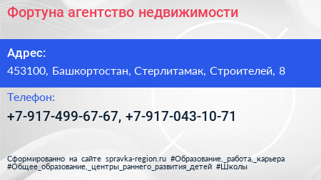 Фортуна, агентство недвижимости по адресу 453100, Башкортостан, Стерлитамак, Строителей, 8 в дальнейшем Организация, размещена в следующих категориях: