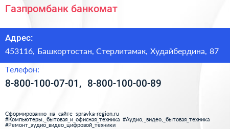 Газпромбанк, банкомат по адресу 453116, Башкортостан, Стерлитамак, Худайбердина, 87 в дальнейшем Организация, размещена в следующих категориях: