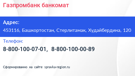 Газпромбанк, банкомат по адресу 453116, Башкортостан, Стерлитамак, Худайбердина, 120 в дальнейшем Организация, размещена в следующих категориях: