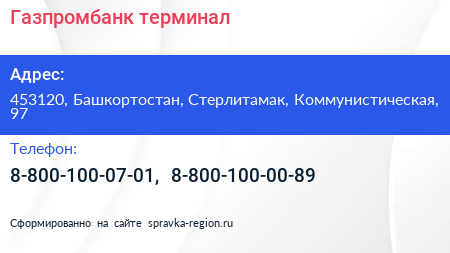 Газпромбанк, терминал по адресу 453120, Башкортостан, Стерлитамак, Коммунистическая, 97 в дальнейшем Организация, размещена в следующих категориях:
