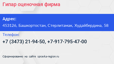 Гипар, оценочная фирма по адресу 453126, Башкортостан, Стерлитамак, Худайбердина, 58 в дальнейшем Организация, размещена в следующих категориях: