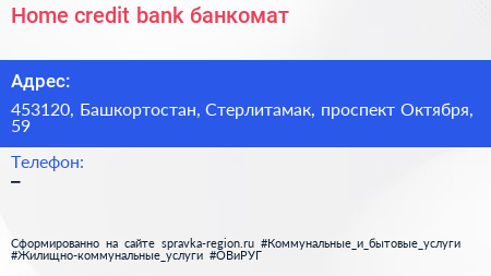 Home credit bank, банкомат по адресу 453120, Башкортостан, Стерлитамак, проспект Октября, 59 в дальнейшем Организация, размещена в следующих категориях: