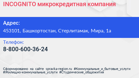 INCOGNITO, микрокредитная компания по адресу 453101, Башкортостан, Стерлитамак, Мира, 1а в дальнейшем Организация, размещена в следующих категориях: