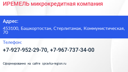 ИРЕМЕЛЬ, микрокредитная компания по адресу 453100, Башкортостан, Стерлитамак, Коммунистическая, 70 в дальнейшем Организация, размещена в следующих категориях: