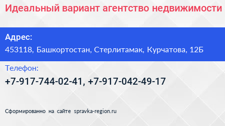 Идеальный вариант, агентство недвижимости по адресу 453118, Башкортостан, Стерлитамак, Курчатова, 12Б в дальнейшем Организация, размещена в следующих категориях:
