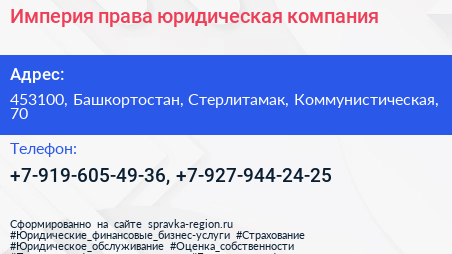 Империя права, юридическая компания по адресу 453100, Башкортостан, Стерлитамак, Коммунистическая, 70 в дальнейшем Организация, размещена в следующих категориях: