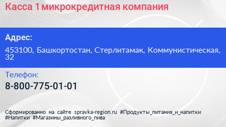 Касса №1, микрокредитная компания по адресу 453100, Башкортостан, Стерлитамак, Коммунистическая, 32 в дальнейшем Организация, размещена в следующих категориях: