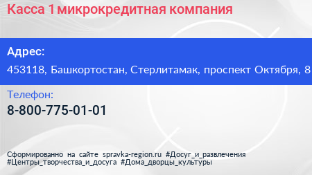 Касса №1, микрокредитная компания по адресу 453118, Башкортостан, Стерлитамак, проспект Октября, 8 в дальнейшем Организация, размещена в следующих категориях: