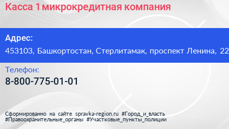 Касса №1, микрокредитная компания по адресу 453103, Башкортостан, Стерлитамак, проспект Ленина, 22 в дальнейшем Организация, размещена в следующих категориях: