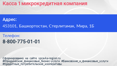 Касса №1, микрокредитная компания по адресу 453101, Башкортостан, Стерлитамак, Мира, 1Б в дальнейшем Организация, размещена в следующих категориях: