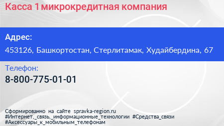 Касса №1, микрокредитная компания по адресу 453126, Башкортостан, Стерлитамак, Худайбердина, 67 в дальнейшем Организация, размещена в следующих категориях: